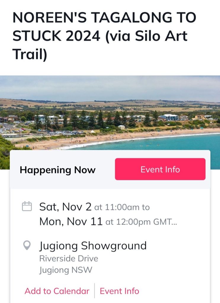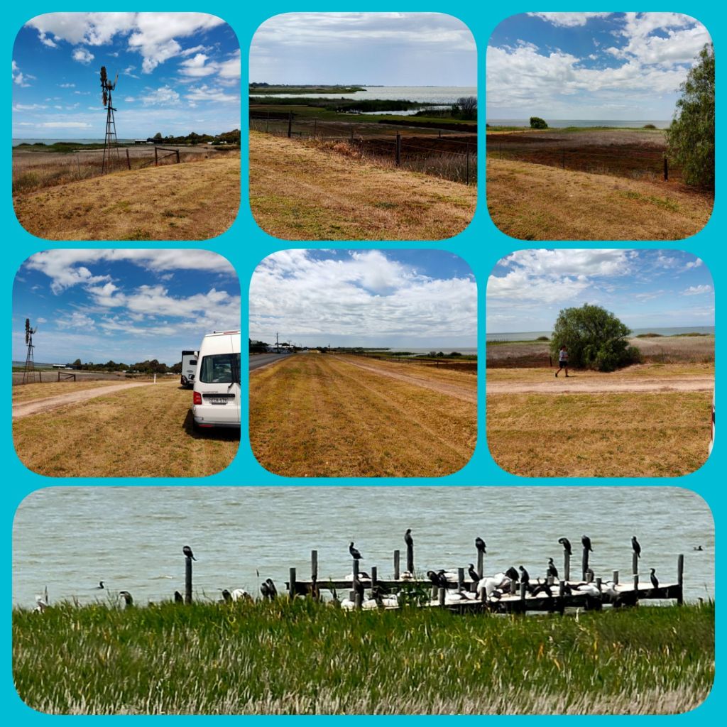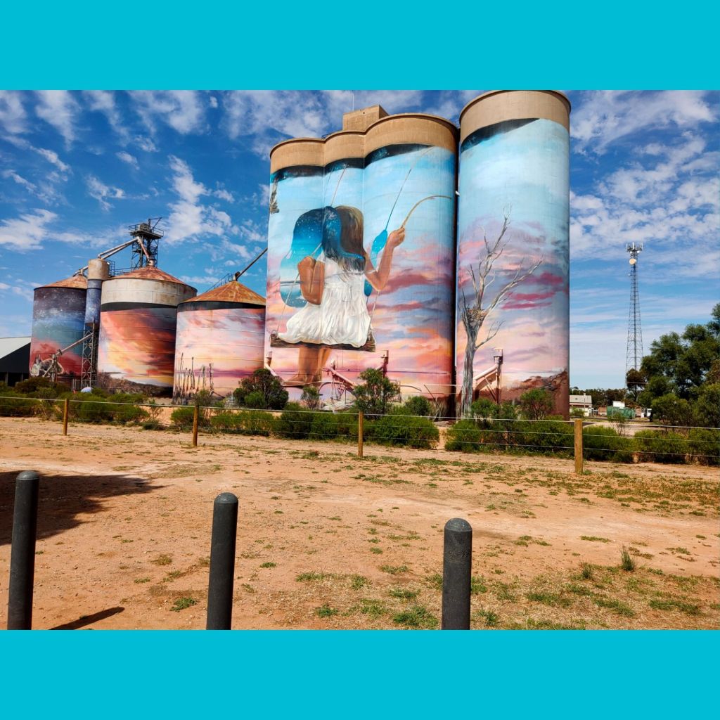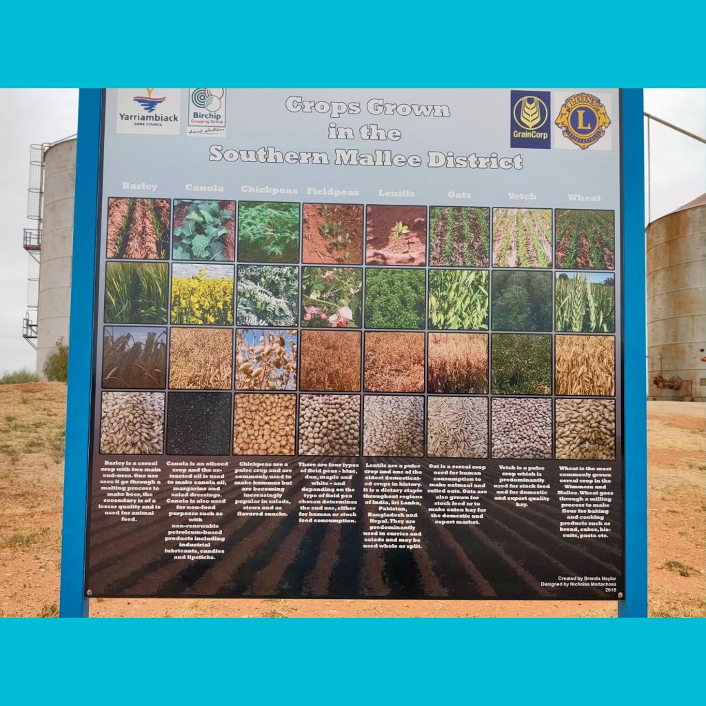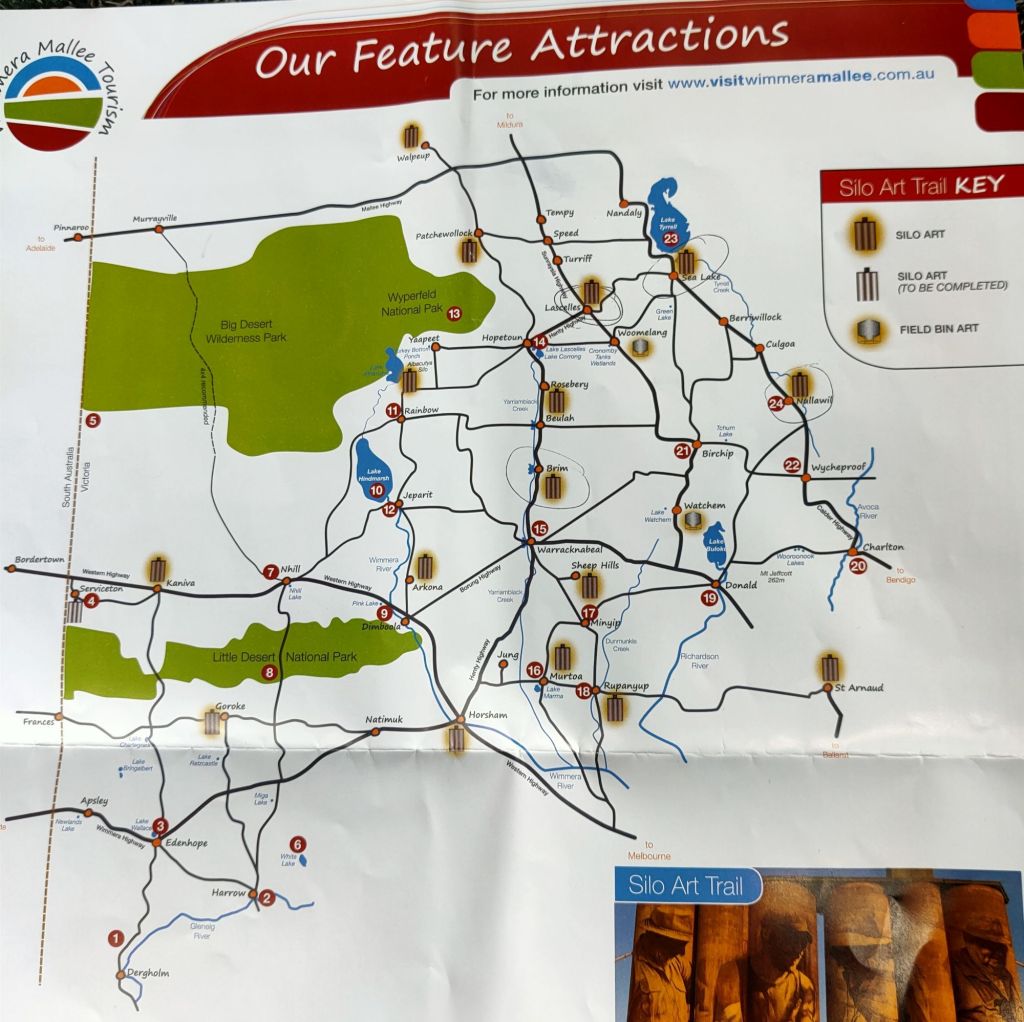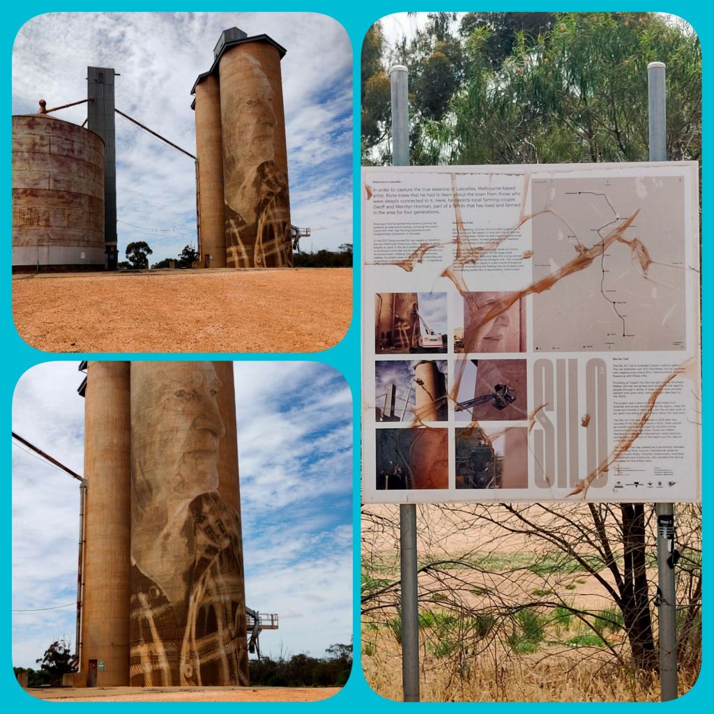 Nullawil at the beginning of our silo trail.SeaLakeSilo trail Lascellles Lascellles – we had lunch, a hamburger from the local cafe.Reference table of crops grown in the area.Travel buddies Robyn and Zenny.Travelling through the Mallee country. Apparently Mallee fowl are shy, not many are seen according to local cafe owner.Brim Recreational Park , RV friendly.Silo at Horsham.Bordertown Recreation Park SA. Lovely overnight stop. Staying for 2 nights, maybe 3. The community have done a remarkable job . Lots of bird life hence nesting boxes up in the trees. Only 280k to STUCK Event so not far to go.Bordertown Recreation area.The ferry at Wellington SAMilgate SA