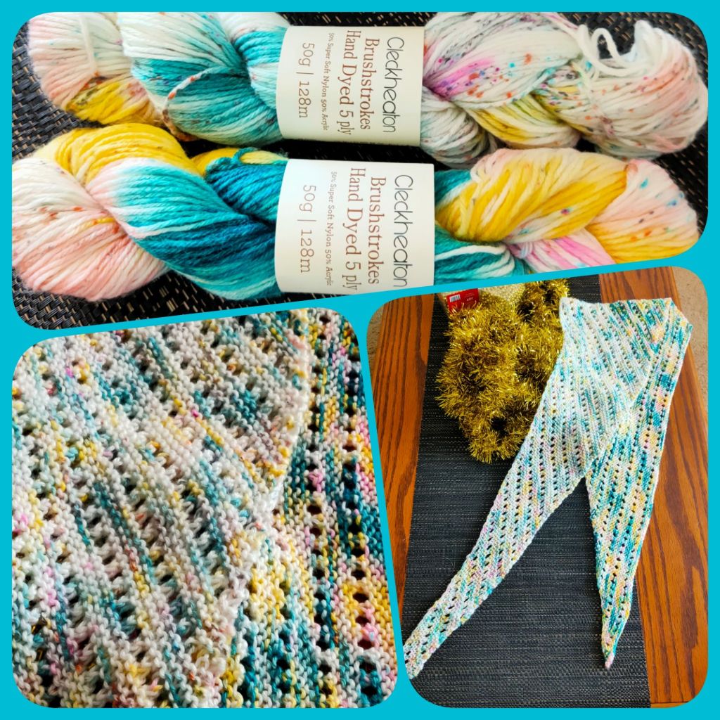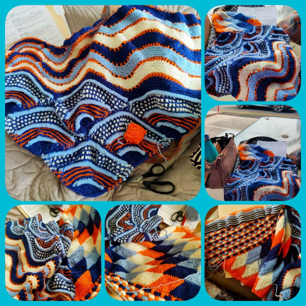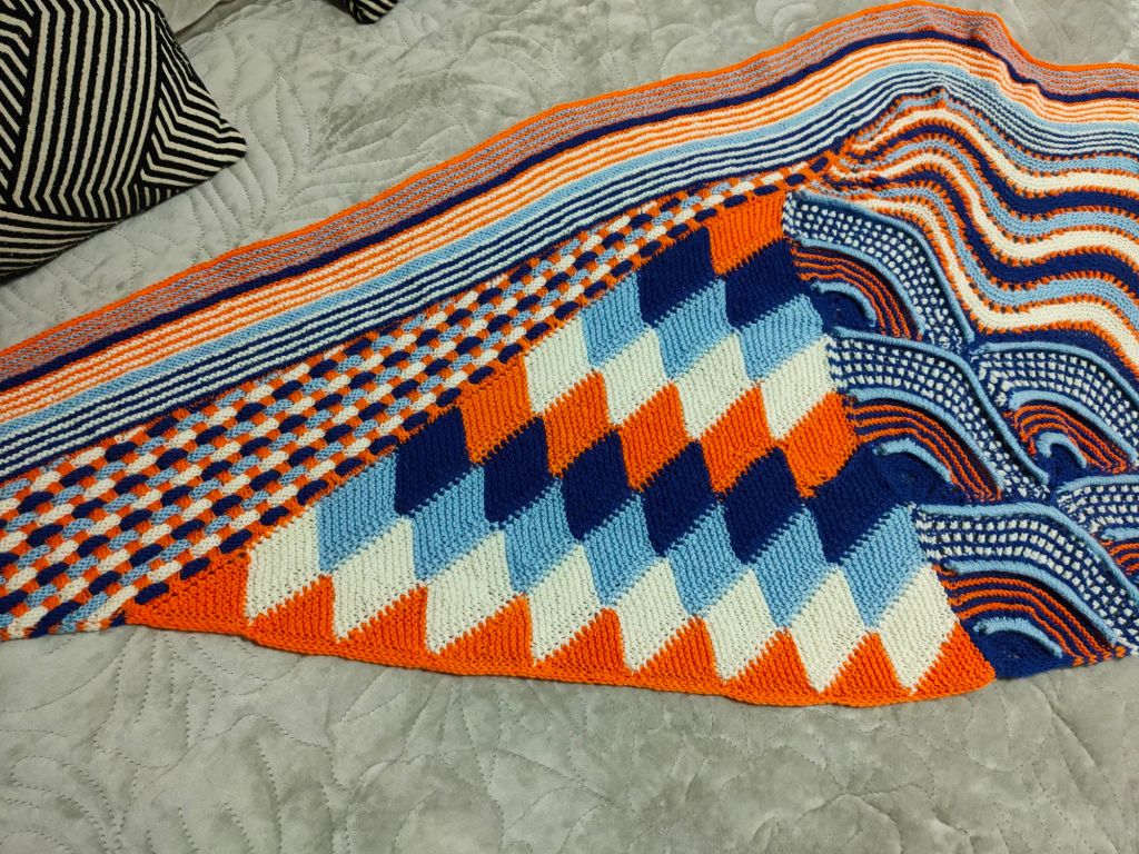 I chose these colours from my stash and purchased the fourth colour after much deliberation, pale blue.Not sure where this is going. Music theme so could be a record? CD?Many of the techniques I’ve not done before, some I will never repeat. It’s interesting seeing the color combinations and textures that combine to make a unique fabric. This is becoming a work of art!Finished shawl, it’s huge… completed 28 October 2025.