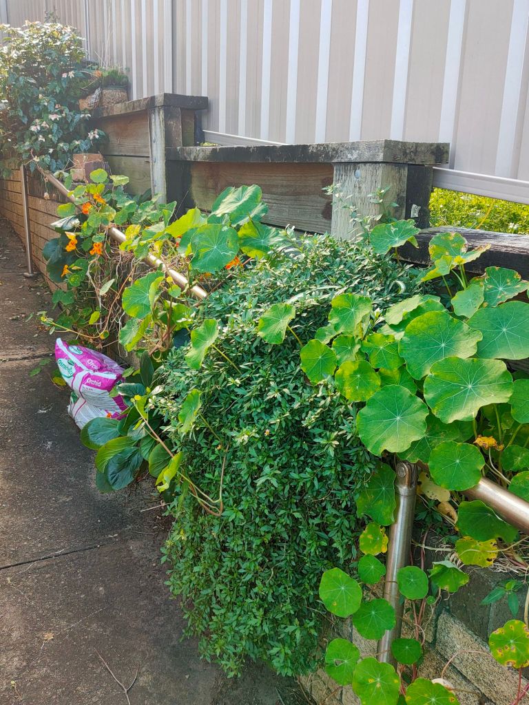 No turning back now! I’m very grateful to the neighbours for agreeing to take down a section of colourbond fencing to allow access of the heavy equipment through to the backyard.When I got the quote I was wearing the cumbersome moon boot. Rob suggested the more shallow steps which have worked out well. They are finished off with a textured surface.Thanks to ALDI and Bunnings the van made it possible to transport several loads of soil/compost and mulch.