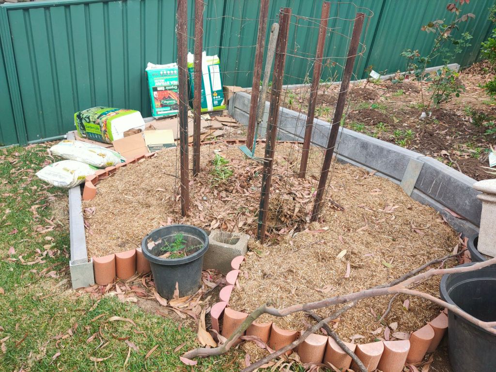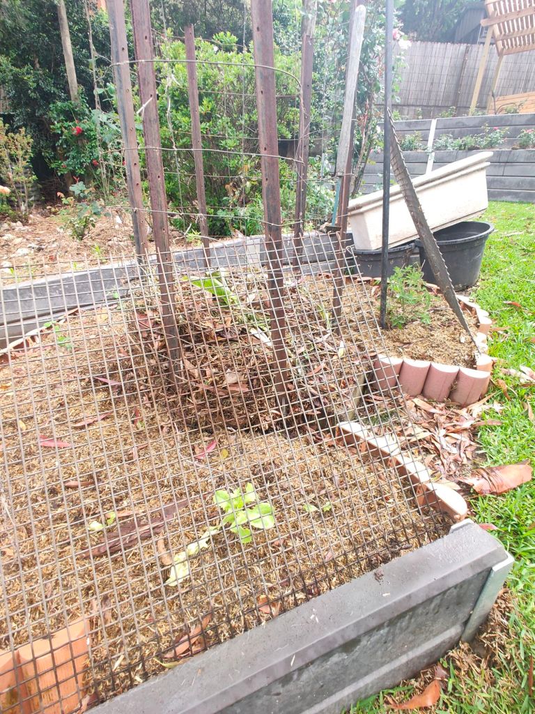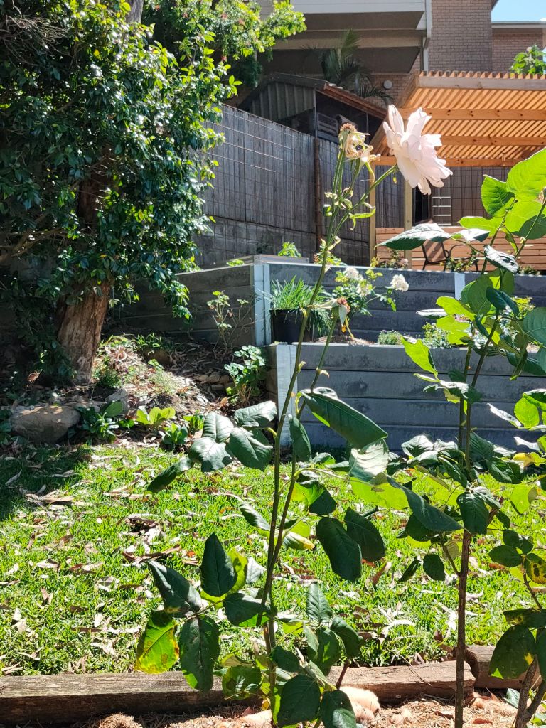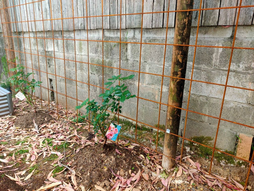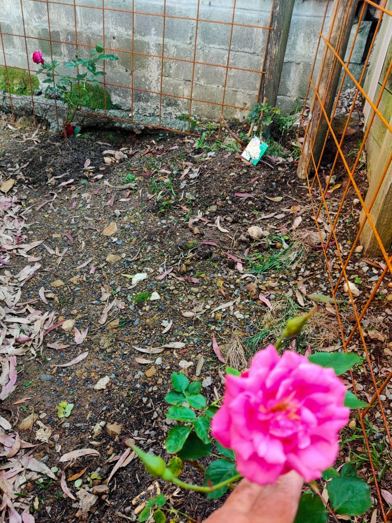 This pretty little pink climbing rose is a surprise. I ordered Blackboy, a deep red highly perfumed rose I remembered from my grandmother’s garden. Never mind, it’s a keeper.Double Delight – new bare root rose I’m experimenting with a mixed flower cover crop on this level to build up the soil. So far I can see some seeds have germinated.Amongst the 7 original 30yr old roses are an additional 15 new season bare rooted roses I ordered during winter. Some sentimental favorites others more modern types.I loved my original ring garden, it worked well. The idea is to water through the compost which leeches out to the garden area providing nutrients and moisture to the plants. Beans and snow peas grow up the wire saving space. I’ve been discovering tomatoes, lettuce and pumpkins coming up amongst the plants throughout the yard from the compost I’ve put around them. They are now officially in the veggie garden.Drift and Knockout roses establishing nicely. Behind them the mustard greens and daikon radish seeds have germinated. They are a cover crop to try to break up and improve the clay soil.