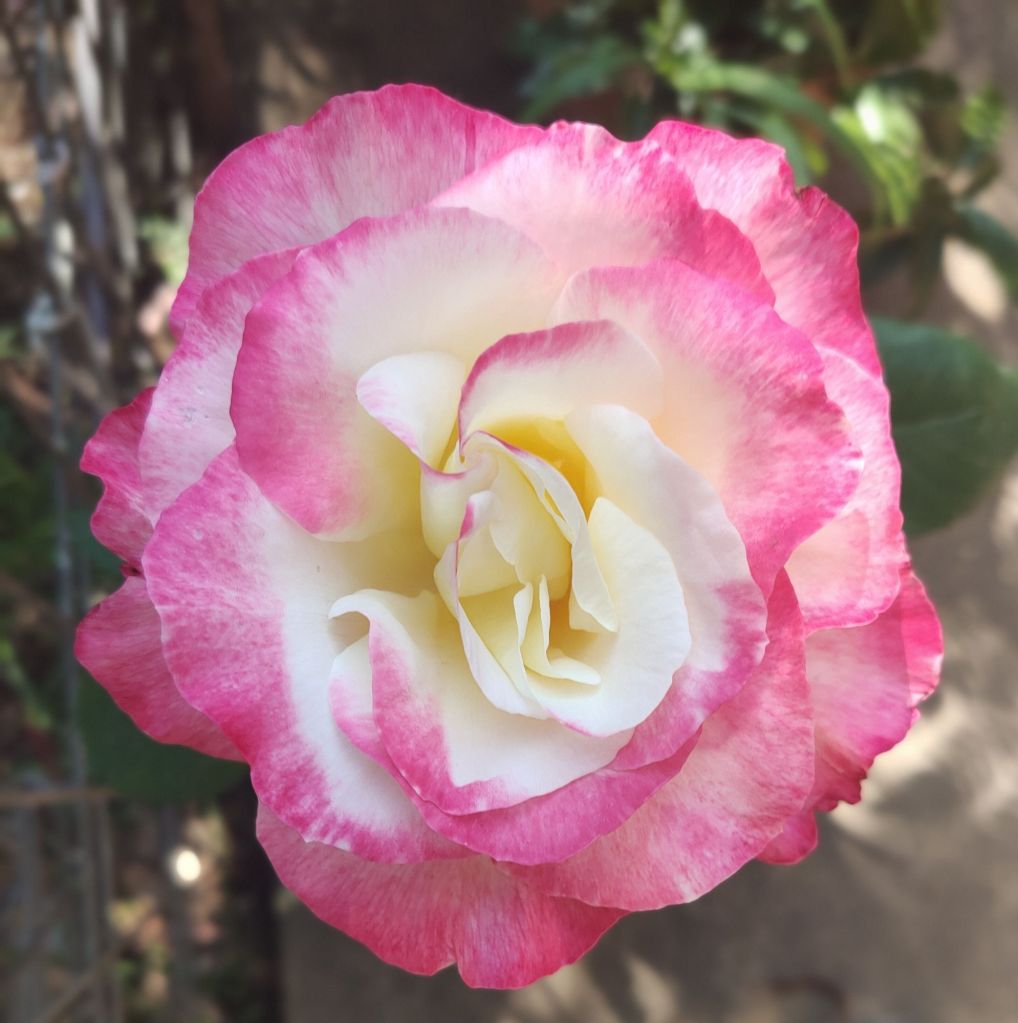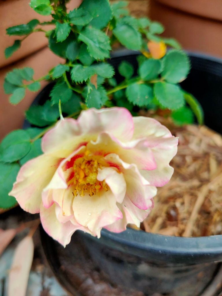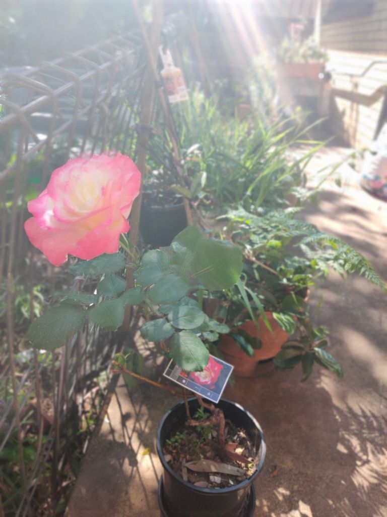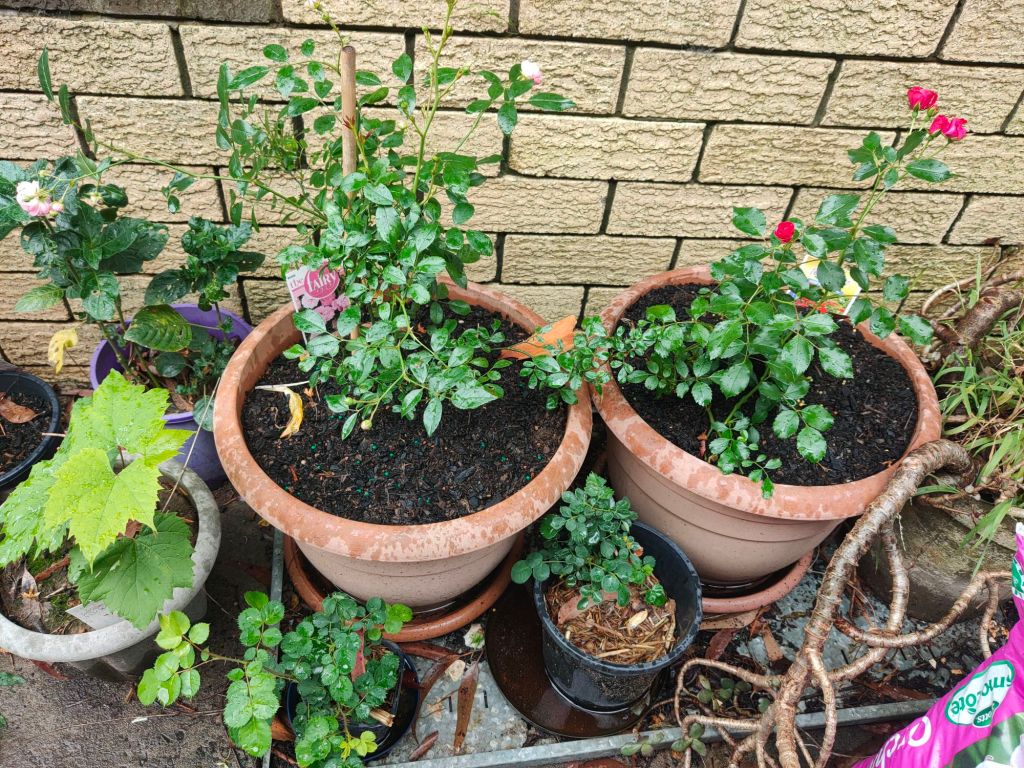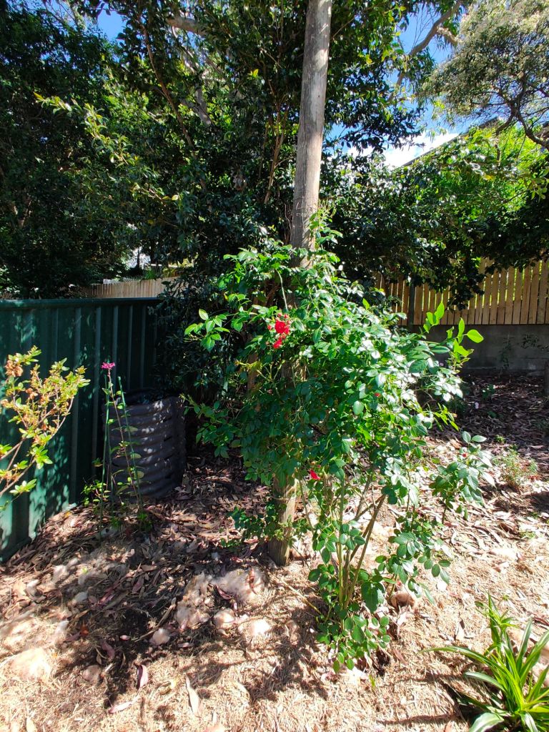 This pretty little pink climbing rose is a surprise. I ordered Blackboy, a deep red highly perfumed rose I remembered from my grandmother’s garden. Never mind, it’s a keeper.Double Delight – new bare root rose I’m experimenting with a mixed flower cover crop on this level to build up the soil. So far I can see some seeds have germinated.Amongst the 7 original 30yr old roses are an additional 15 new season bare rooted roses I ordered during winter. Some sentimental favorites others more modern types.I loved my original ring garden, it worked well. The idea is to water through the compost which leeches out to the garden area providing nutrients and moisture to the plants. Beans and snow peas grow up the wire saving space. I’ve been discovering tomatoes, lettuce and pumpkins coming up amongst the plants throughout the yard from the compost I’ve put around them. They are now officially in the veggie garden.Drift and Knockout roses establishing nicely. Behind them the mustard greens and daikon radish seeds have germinated. They are a cover crop to try to break up and improve the clay soil.