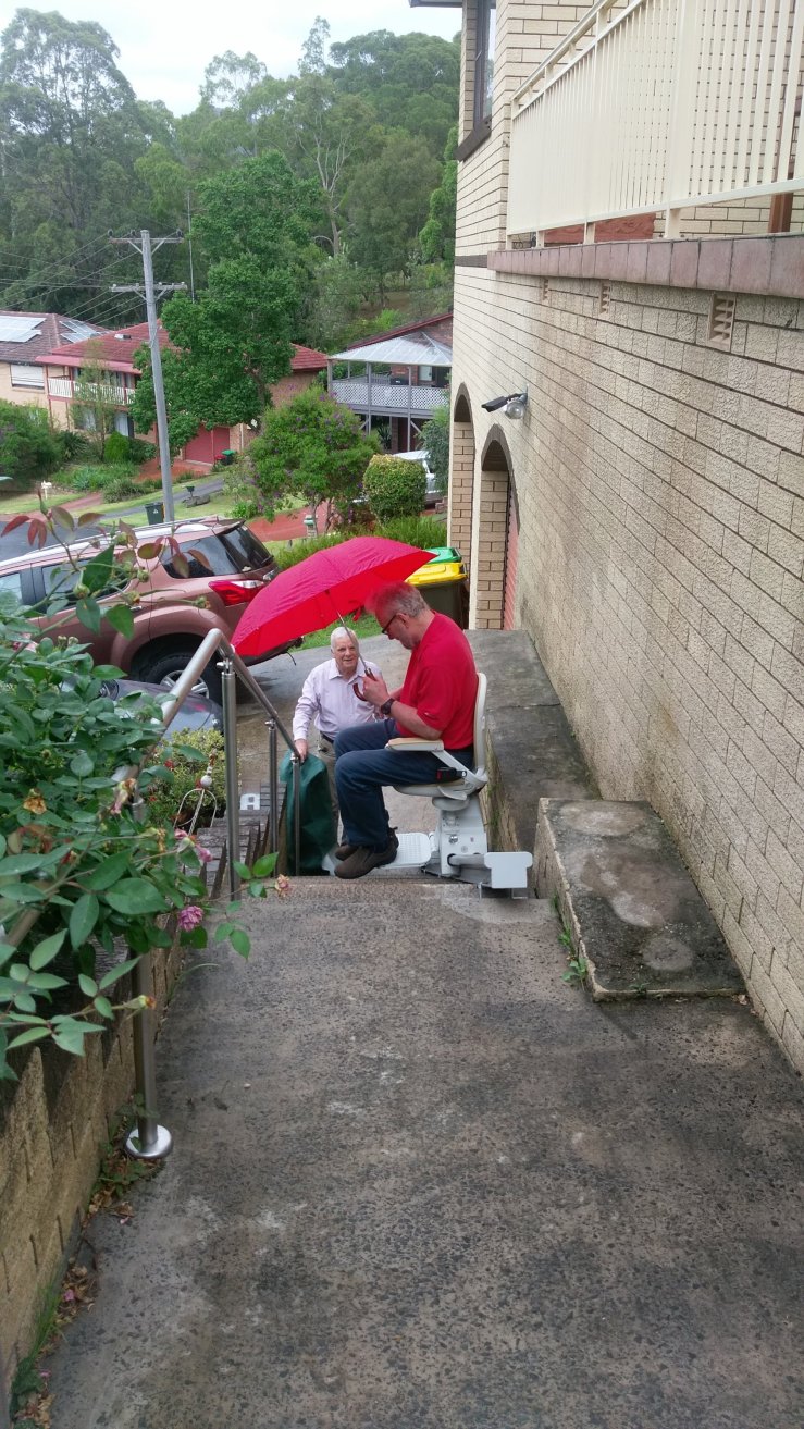 When we knew Chris was coming home the OT came to do a home inspection. She suggested rails up our front steps which would continue up the side of the house and around the back to the back door. A grab rail at the door and in the bathroom next to the toilet plus in the shower. Other aids were recommended. The house plan gave adaquate and safe space for Chris to manage. A chair lift was needed for the front 13 steps. As it was getting close to Christmas I was concerned that the modifications may not be done in time. Fortunately the work was not delayed.
