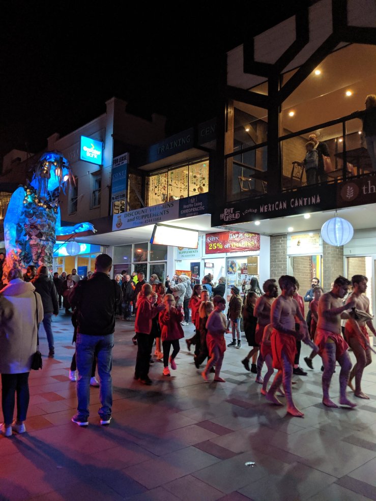 Procession down the mall. Marri Dyin (pronounced Mahr-ee Djin), meaning ‘Great Woman” in Eora language, is a 6m high puppet which made it’s first appearance outside of Sydney where it featured at VIVID.