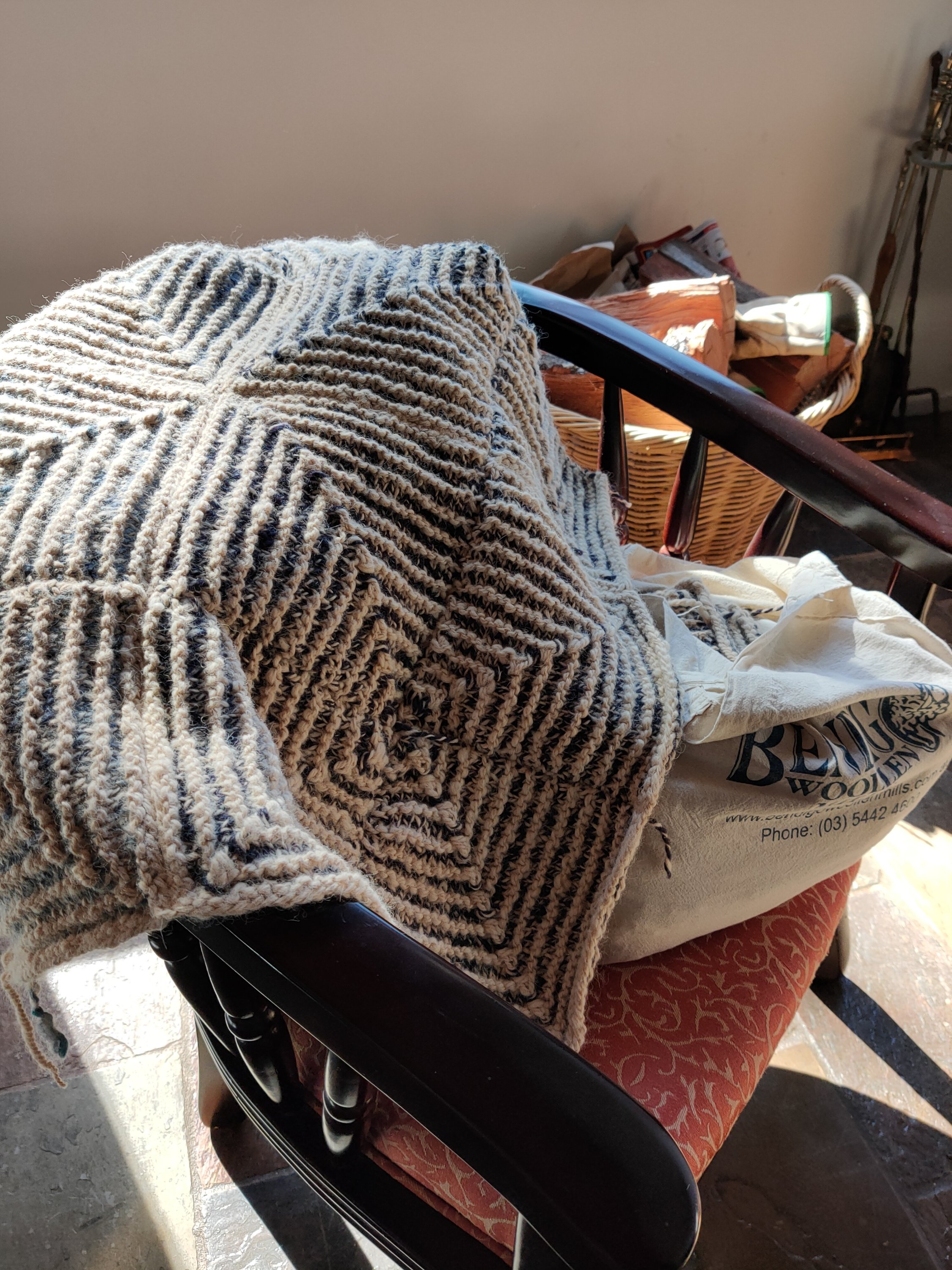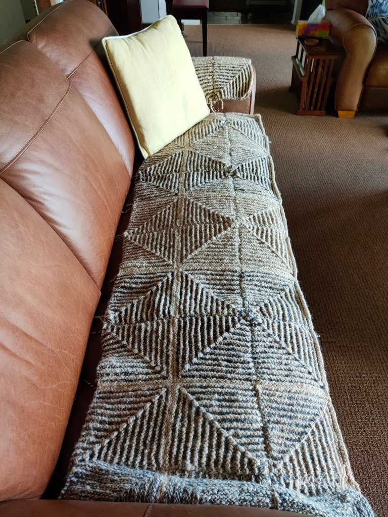 My latest knitting project is progressing well. I sewed all the squares together and made the decision to add another row to the main piece so that means another 10 squares. Now I have to spin up more alpaca.